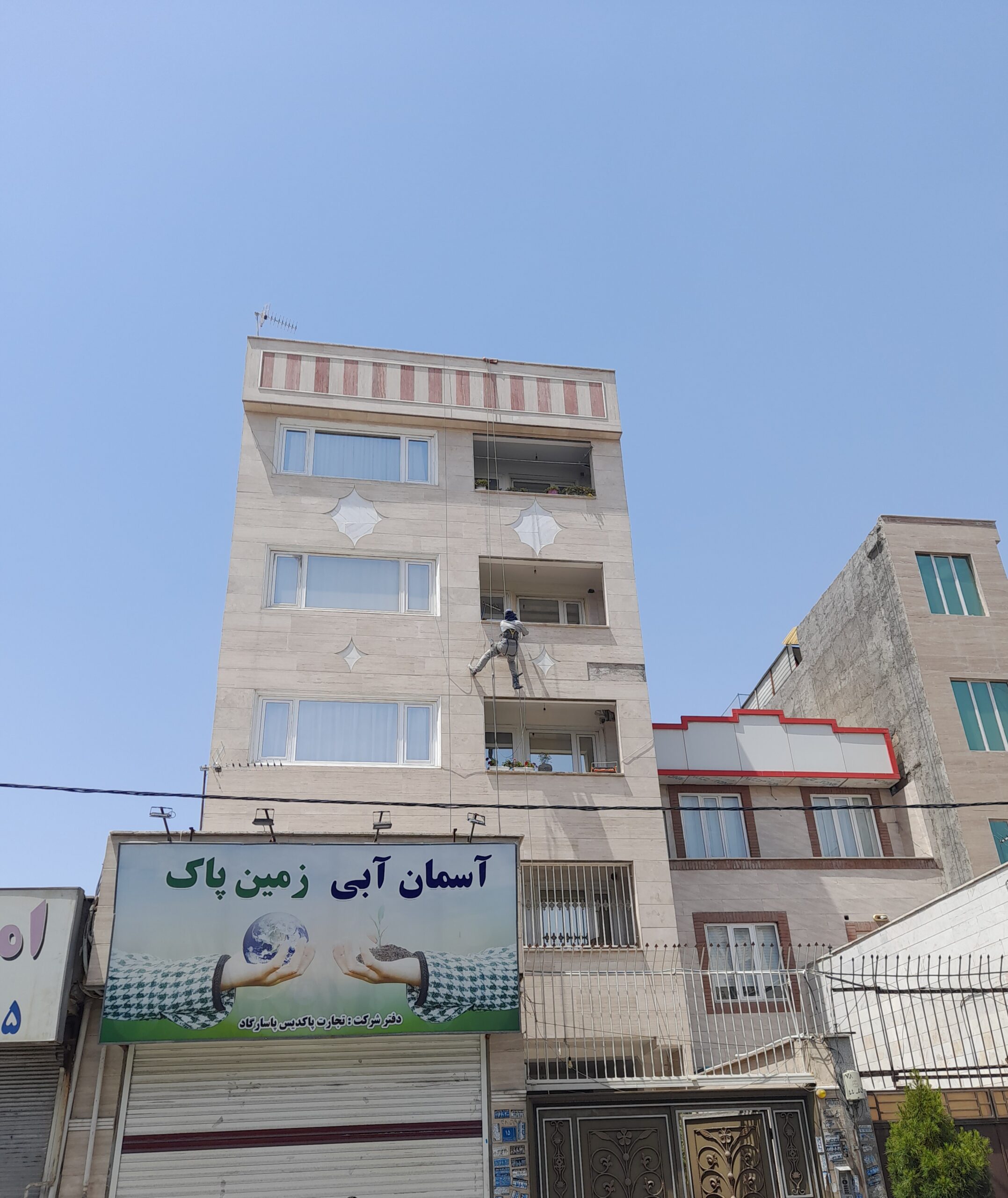 - بعد از آویزان شدن و تنظیم کردن جای خود ابزار خود را از شخص پا طنابی یا همان نیروی کمکی، دریافت می نماید و شروع به اجرا می کند. توجه فرمایید که هنگام اجرای این خدمات هیچ گونه ترددی در حریم ساختمان نباید باشد.